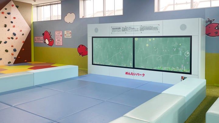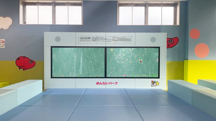 チームラボの展示「こびとが住まう黒板」では、黒板の中にこびとやめんたいパークのキャラクターが住んでいます。