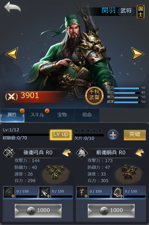 レベルを上げたり、武将の欠片を集めて突破させたりすることでより強力に!