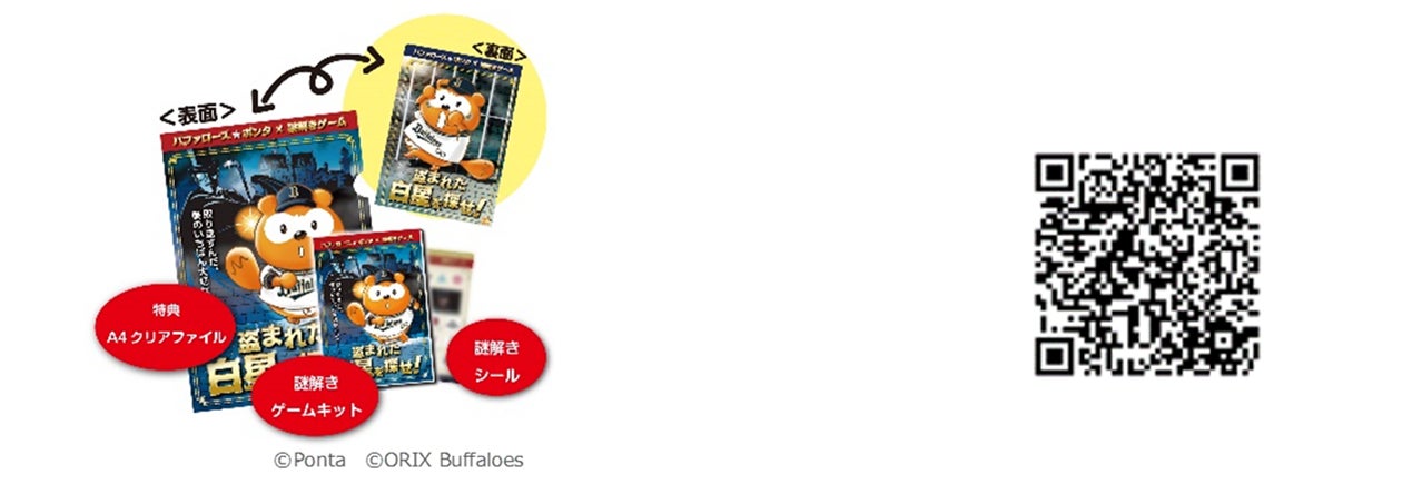 このたび発売する「バファローズ☆ポンタ×謎解きゲーム 盗まれた白星を探せ」は、Ponta初の謎解きゲームとなります。ある日、謎の怪盗に盗まれてしまったバファローズ☆ポンタの白星(☆)を、謎を解くことでバファローズ☆ポンタと一緒に取り返すストーリーです。バファローズ☆ポンタファンや野球ファンはもちろん、謎解きファンにもお楽しみいただけます。キットを開封し、インターネットにアクセス可能な端末と筆記用具を用意すれば、プレイ可能で、いつでも自宅などのお好きな場所で遊ぶことができます。また、購入特典として、オリジナルクリアファイルを同梱いたします。