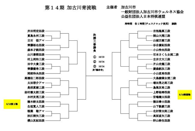 - 第14期加古川青流戦、大盤解説会、決勝戦、トーナメント表