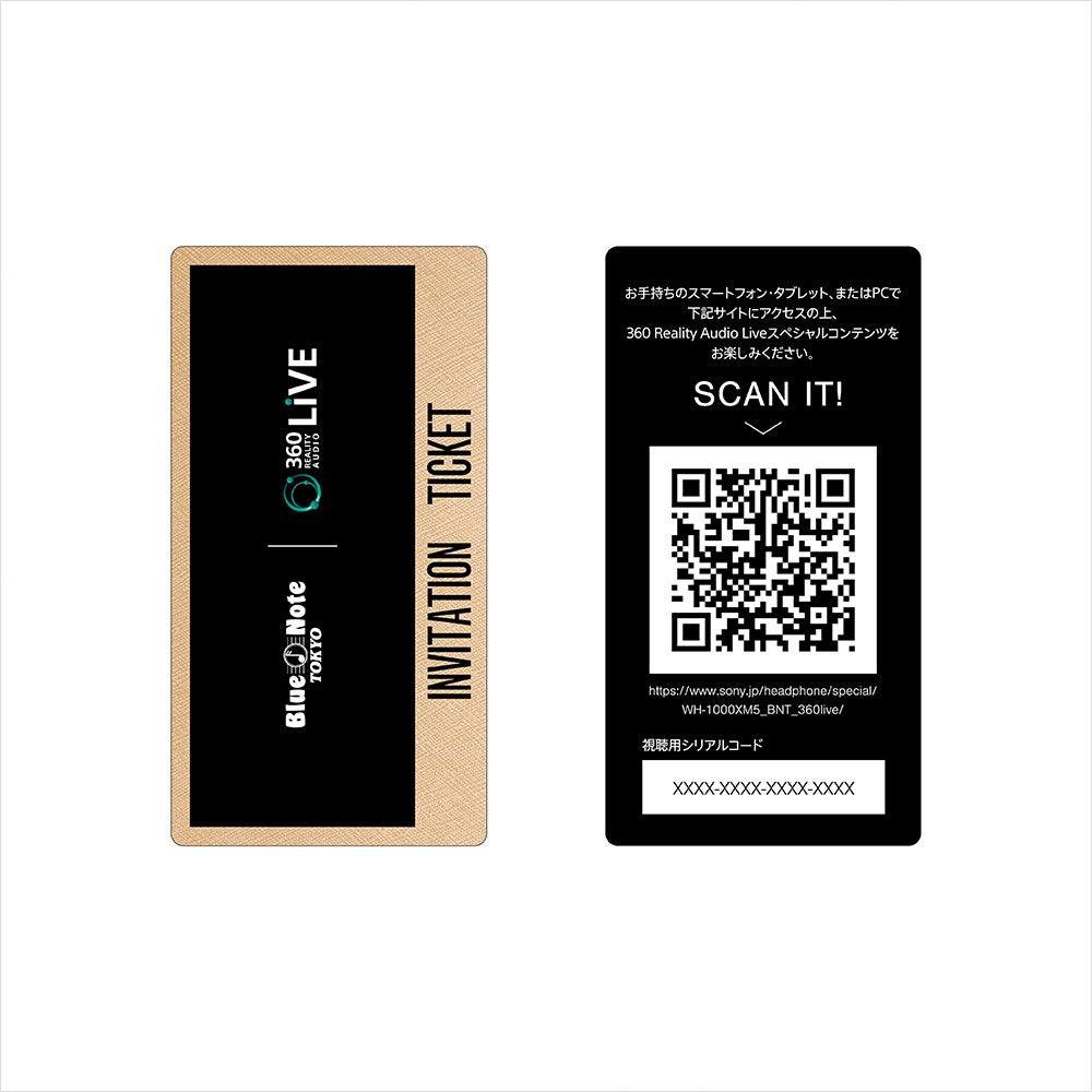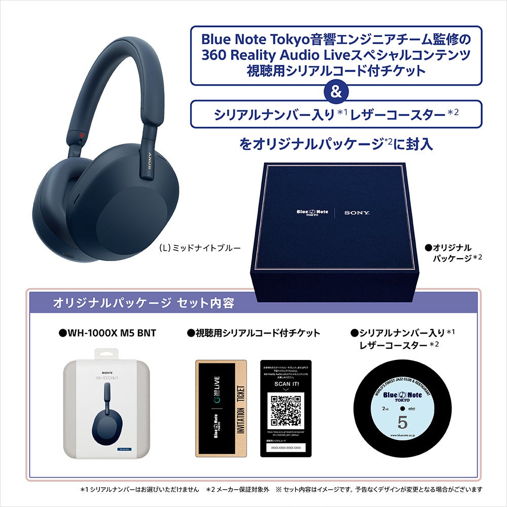 本商品を購入した方全員に、「BLUE NOTE TOKYO」のロゴが入ったオリジナルパッケージ*4に、シリアルナンバー入りのオリジナルレザーコースター*5と360 Reality Audio Liveスペシャルコンテンツ視聴用のシリアルコード付きチケット*6を同梱します。360 Reality Audio Liveは、360 Reality Audioによるライブコンテンツを楽しむためのアプリで、ソニーの360立体音響技術を活用し、立体的な音と映像で、まるでライブ会場にいるかのようなリアリティと臨場感が体験できます。 チケットのシリアルコードをスマートフォンやタブレット等のモバイル機器で読み込み必要情報を入力することで、BLUE NOTE TOKYO音響エンジニアチーム監修による360 Reality Audio Liveスペシャルコンテンツを体験できます。『WH-1000XM5』のノイズキャンセリング性能と高音質による圧倒的な没入感で「BLUE NOTE TOKYO」の極上の音楽体験を自宅で再現します。ライブ収録楽曲は「Blue Horizon」、「Sky Dance」、「Izumi Medley」の計3曲です。