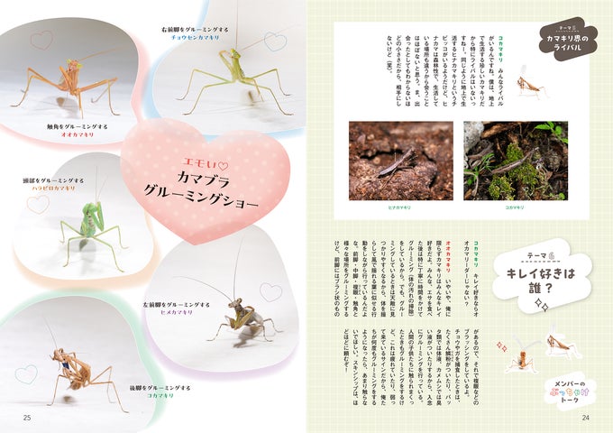 この本は、日本の代表的な5種のカマキリをアイドルグループに見立て、生態や飼育方法を学べる内容となっています。