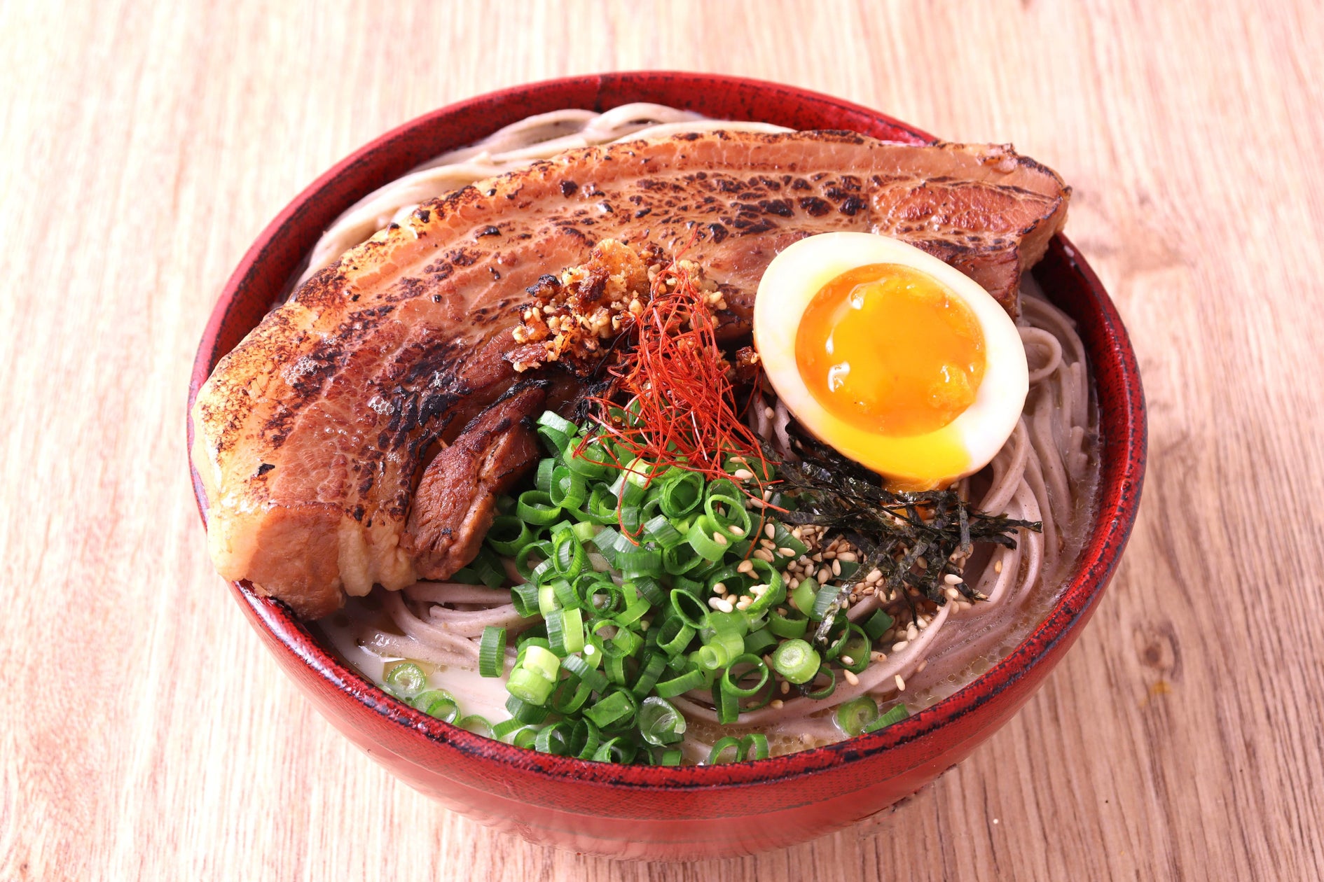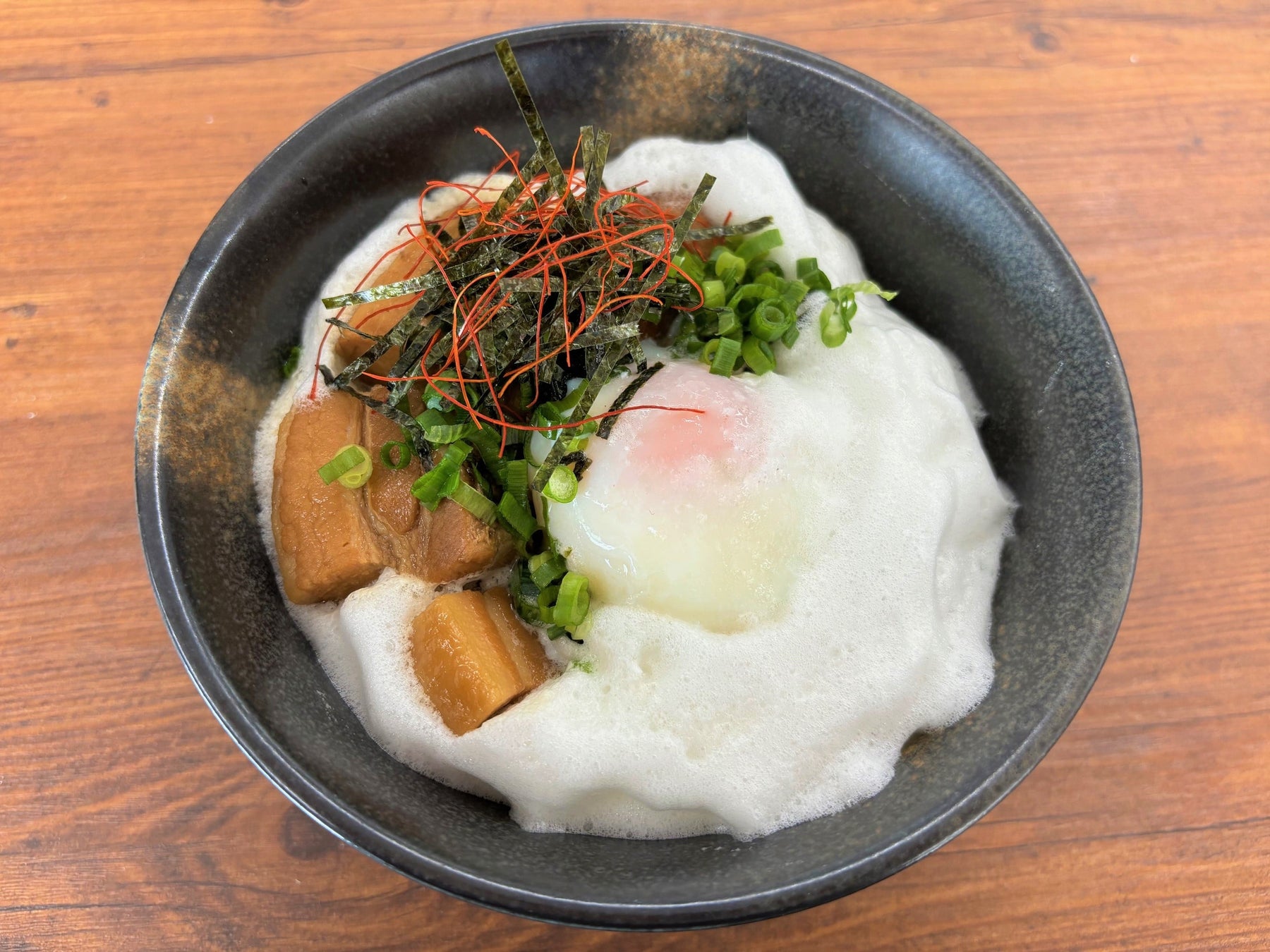 香ばしい角煮をのせたまぜそばで、深いつゆが特徴です。