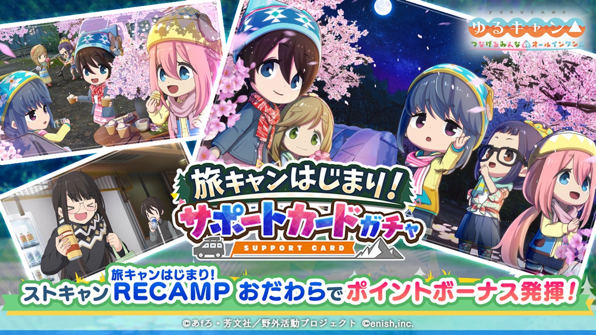 ストキャン「旅キャンはじまり!!RECAMPおだわら」のオリジナルカードやアニメ『ゆるキャン△』の印象的なシーンを使用したカードが手に入る新しいサポートカードガチャが期間限定で開催します。