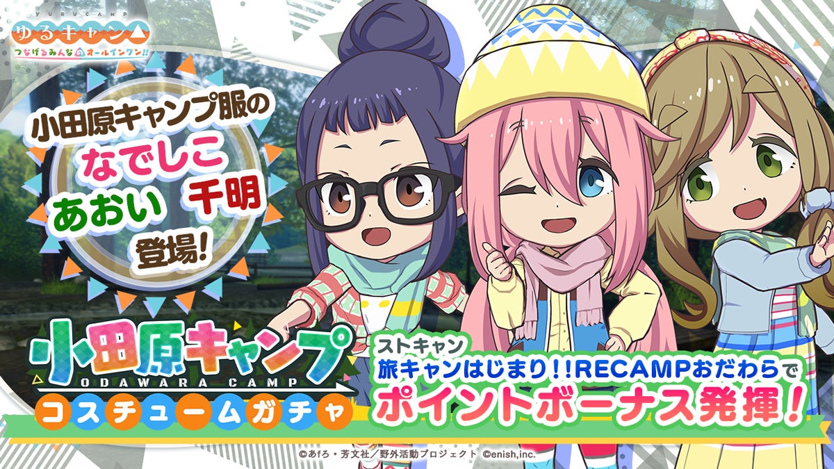 また、ゲームオリジナルのキャンプ服が手に入る【小田原キャンプコスチュームガチャ】やオリジナル旅キャンカードが獲得可能な【旅キャンはじまり!サポートカードガチャ】も同時に開催いたします。
