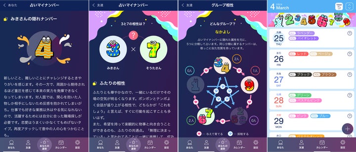 特性や運勢、ラッキーカラーなどが分かり、相性やグループ相性も占えます。