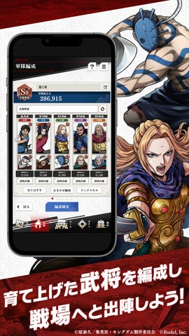 ゲームは育成シミュレーションで、信や嬴政などの武将を育成し、最強の軍隊を編成して戦略的な合戦を楽しめます。