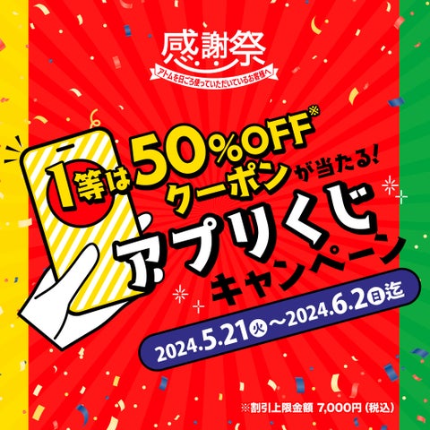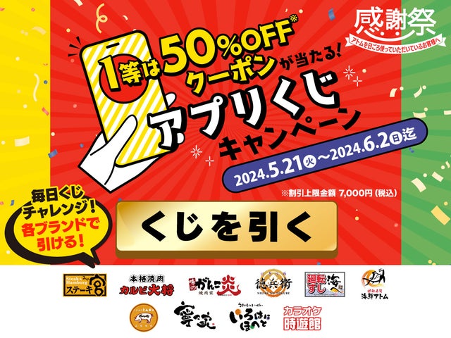 2024年5月21日から6月2日まで、コロワイドグループの株式会社アトムが「1等が50%OFFクーポン当たる!アプリくじキャンペーン」を開催します。
