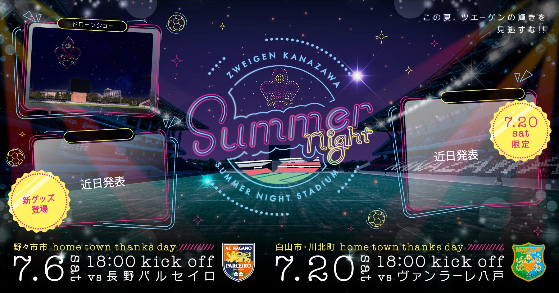 2024年のJ3リーグ試合に合わせて、金沢ゴーゴーカレースタジアムで7月6日と7月20日にドローンショーが開催されます。