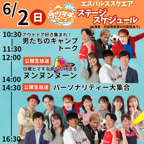 パーソナリティーが集結し、公開生放送やお笑いライブ、音楽ライブなど盛りだくさんのイベントです。