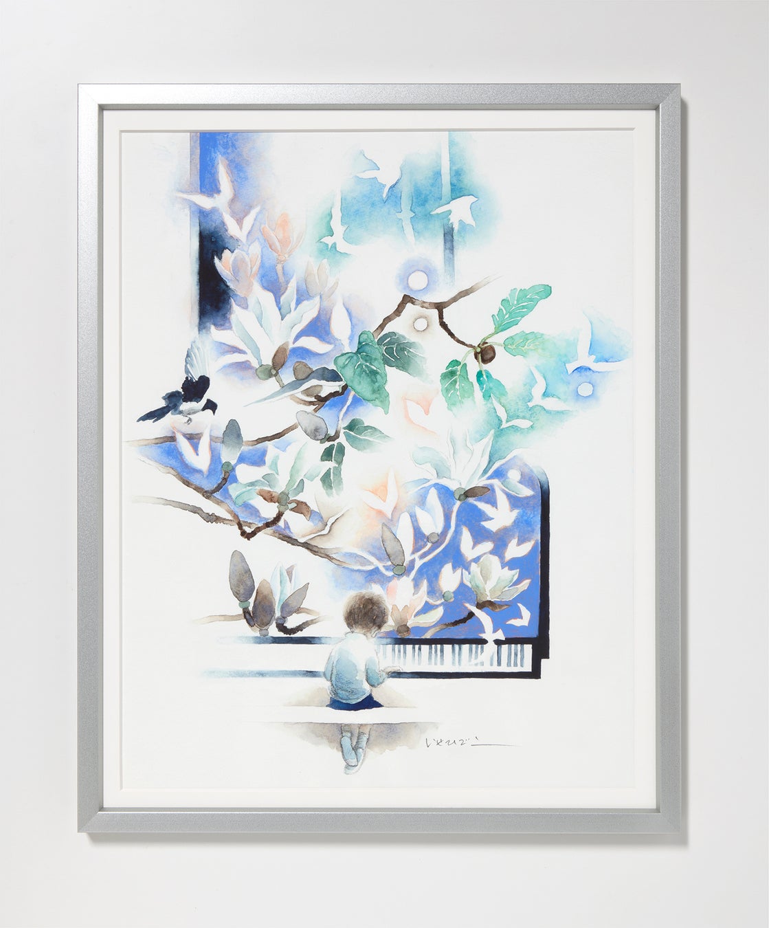 - 作品は近刊絵本『ピアノ』からインスピレーションを得たもので、美しいグラデーションが特徴