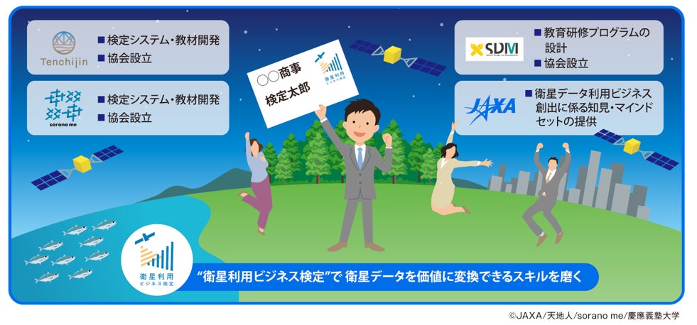 慶應SDMは宇宙人材育成プログラムのノウハウを提供し、JAXAは衛星データの事業化ノウハウを組み合わせ、衛星利用ビジネス検定の事業化を目指しています。