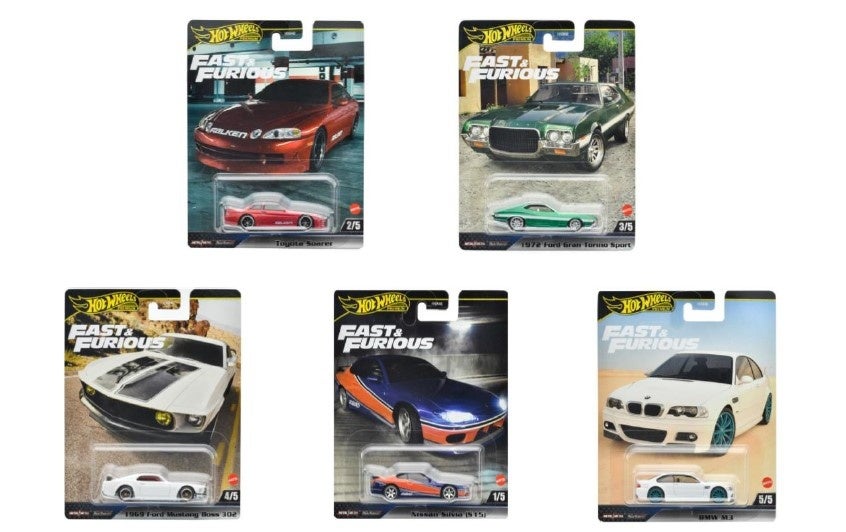 劇中の車両を忠実に再現したミニカーは、走行や飾る楽しみがあり、トヨタ ソアラ、フォード グラン・トリノ、マスタング、日産シルビア、BMW M3の全5種類が展開されます。