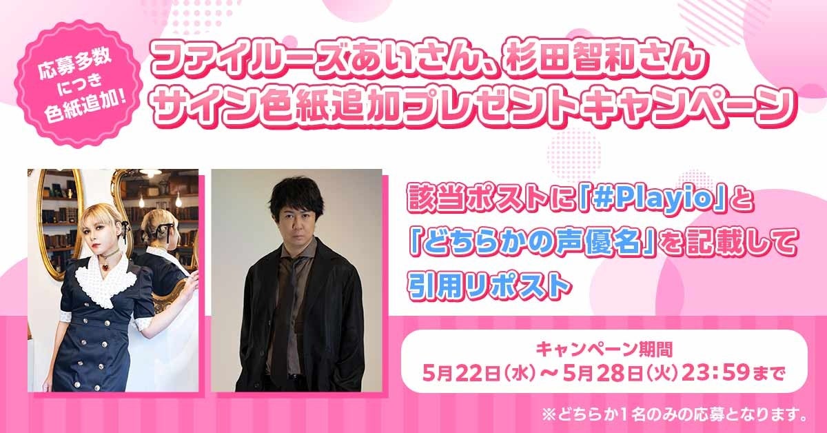 株式会社凸は2024年5月14日から21日に開催された「Playio」サービスサイトのナレーションを担当したファイルーズあいさんと杉田智和さんの「サイン色紙プレゼントキャンペーン」に多数の応募がありました。