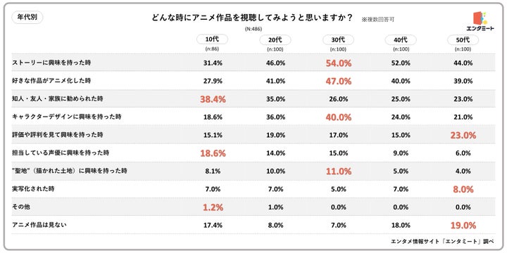 株式会社ドリーム・トレイン・インターネットが運営する「エンタミート」が、全国の10代から50代の男女500人を対象にアニメ視聴に関するアンケートを実施しました。