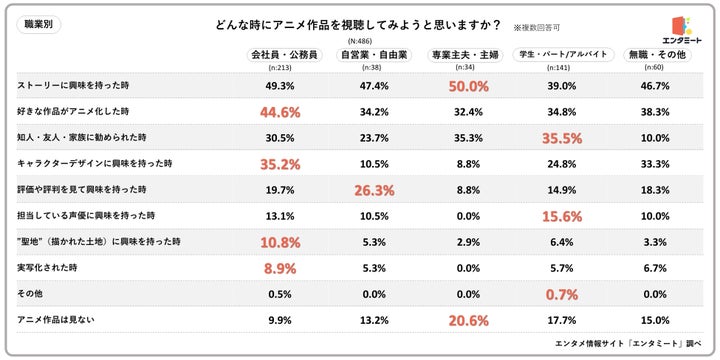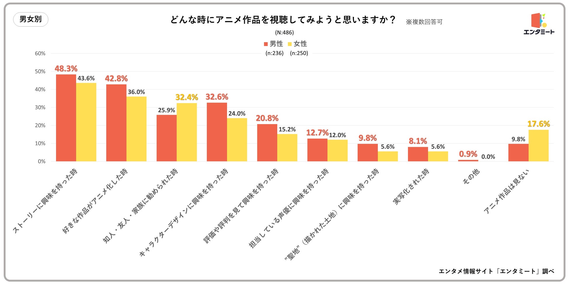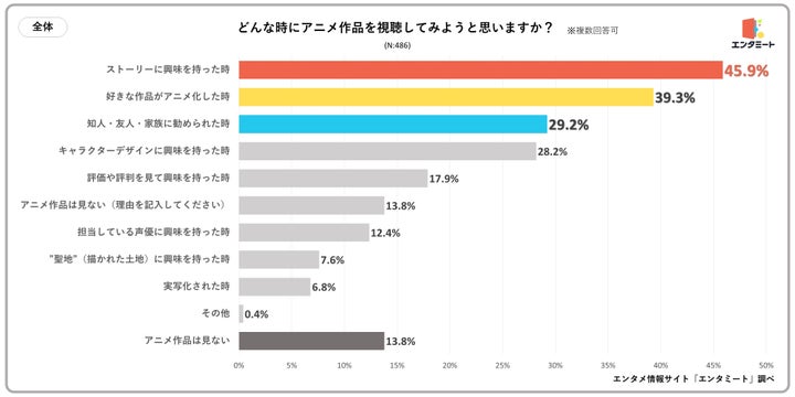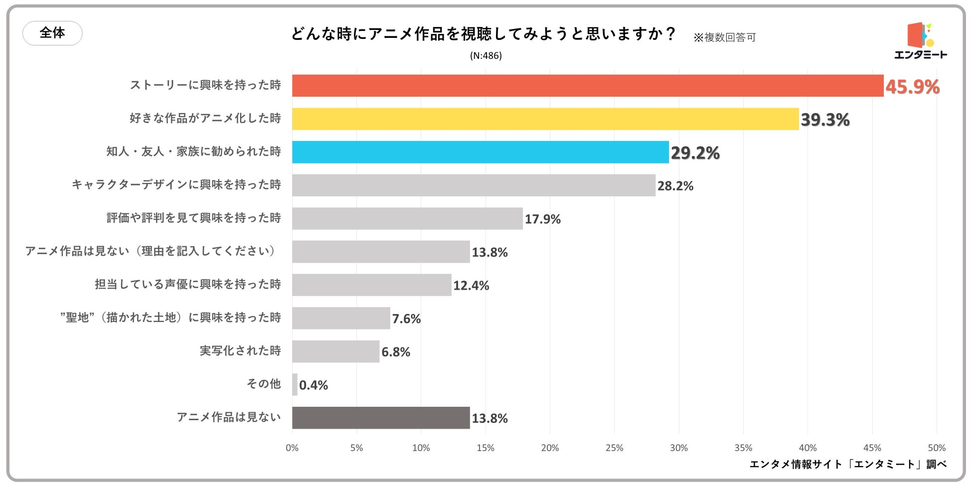アンケート結果によると、視聴の主なきっかけは「ストーリーに興味を持った時」が45.9%で最も多かったです。
