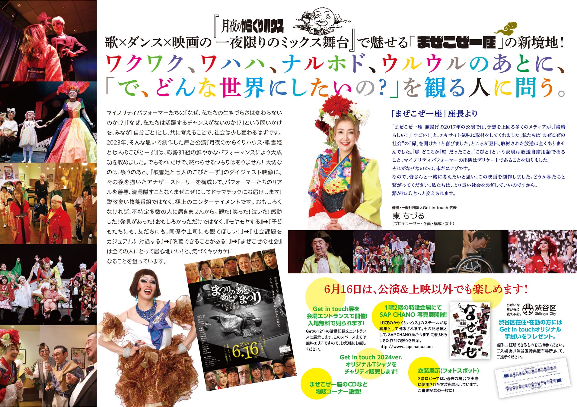 映画と公演の台本はドラァグクィーンのエスムラルダが担当し、渋谷区やアーツカンシル東京などが共催し、企業も協賛しています。