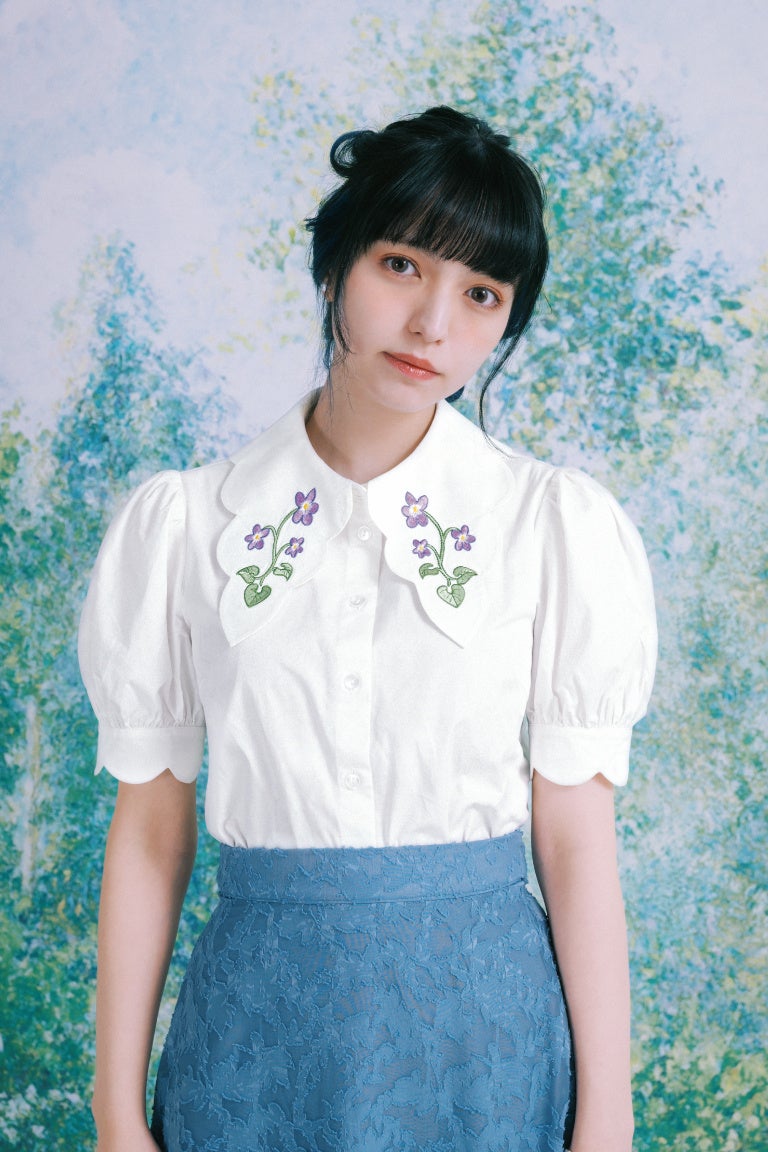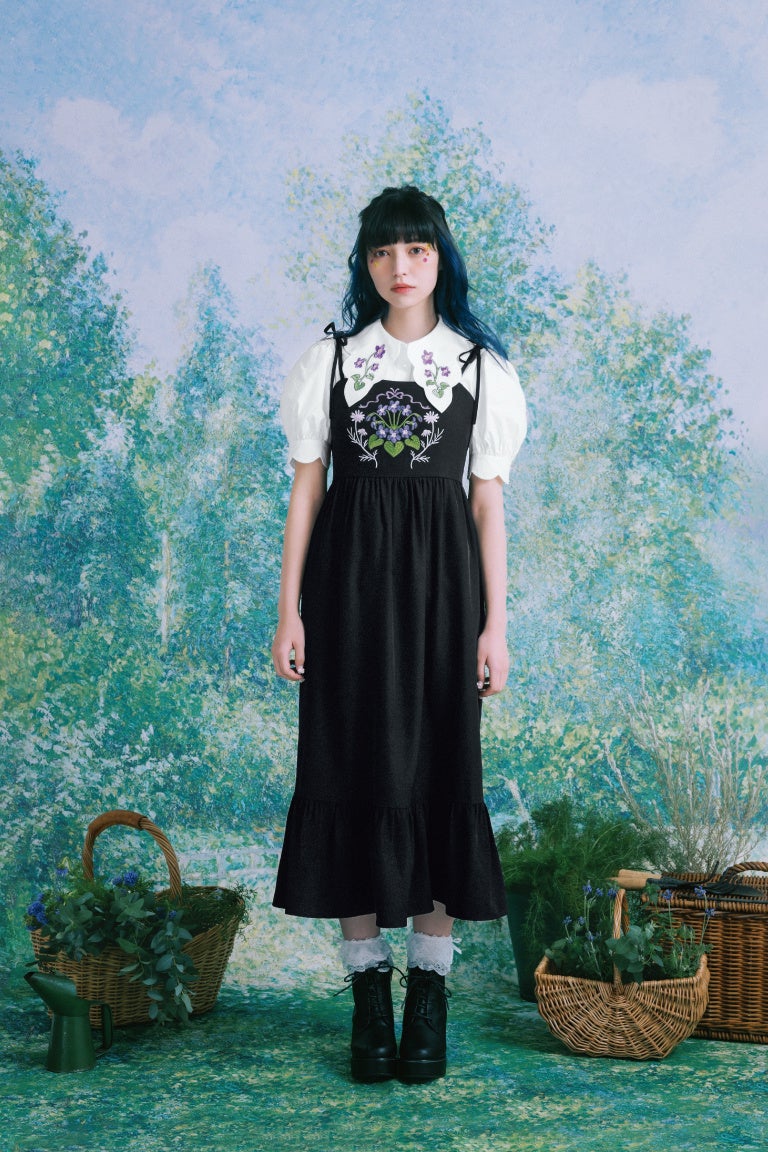 ブラウスにはニオイスミレが刺繍され、ジャンパースカートはファンタジーなデザインです。