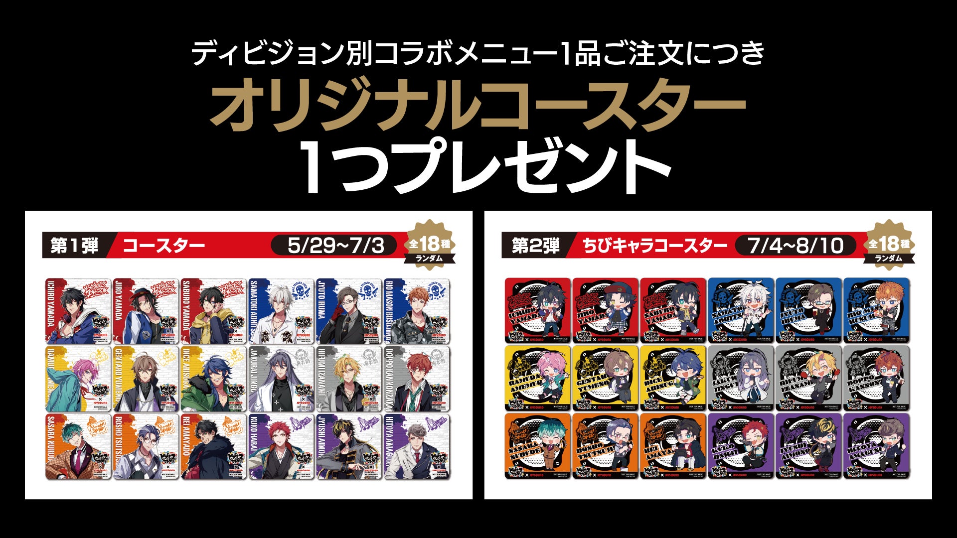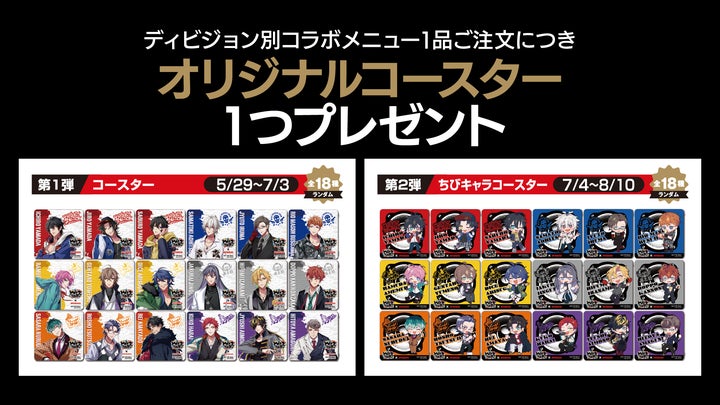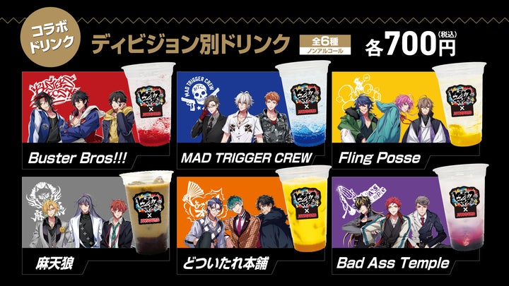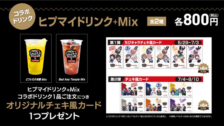 コラボドリンクはディビジョン別やヒプマイドリンク+Mixなど全8種類用意されており、注文特典としてコースターやチェキ風カードがプレゼントされます。