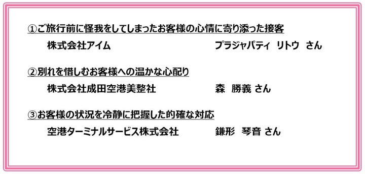 また、成田空港美整社の森勝義さんはお客様の笑顔を引き出し、鎌形琴音さんはバッグの紛失に丁寧に対応しました。