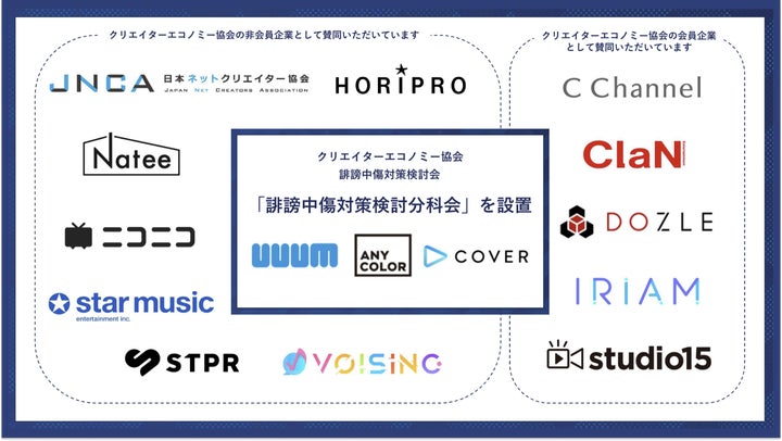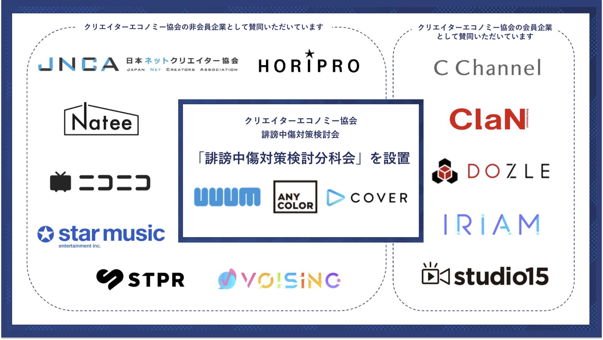 クリエイターエコノミー協会が誹謗中傷対策検討会を設立し、UUUM株式会社、ANYCOLOR株式会社、カバー株式会社が分科会を構成しています。