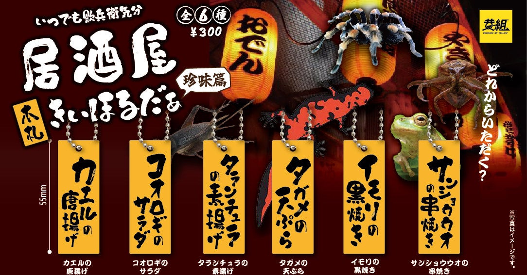イエロー株式会社の「黄組」から、8月に発売予定の「居酒屋看板キーホルダー 第二弾(ゲテモノ編)」のご案内です。