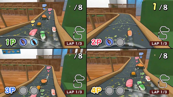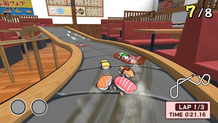 魅力的な寿司のマシンやアイテムを使い、ドリフトやバトルで競い合います。