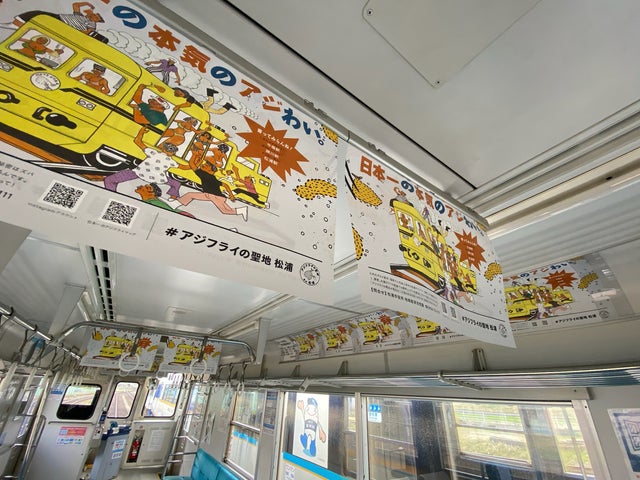 車内では味ぽんとアジフライのラッピングが施され、「アジフライに味ぽん」の理由が紹介されます。