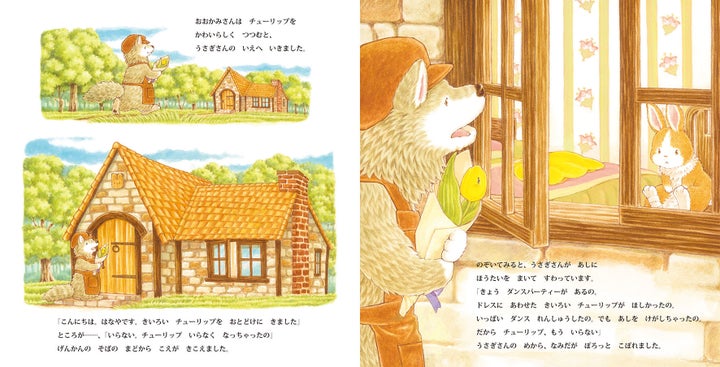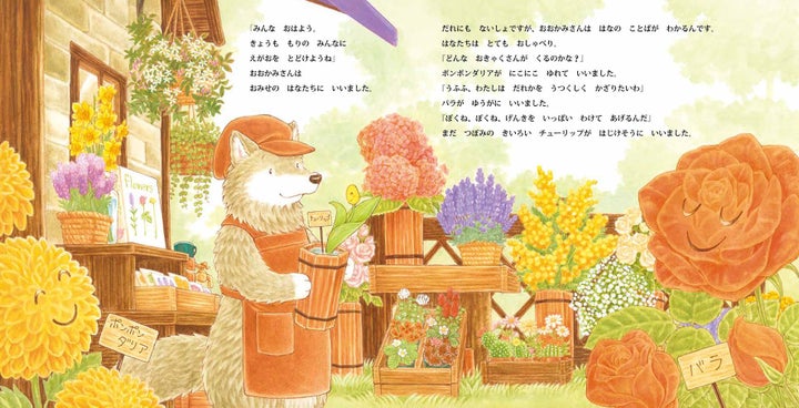 物語では、おおかみさんが花のことばがわかる花屋さんとして活躍し、うさぎさんのケガを手当てする姿が描かれます。