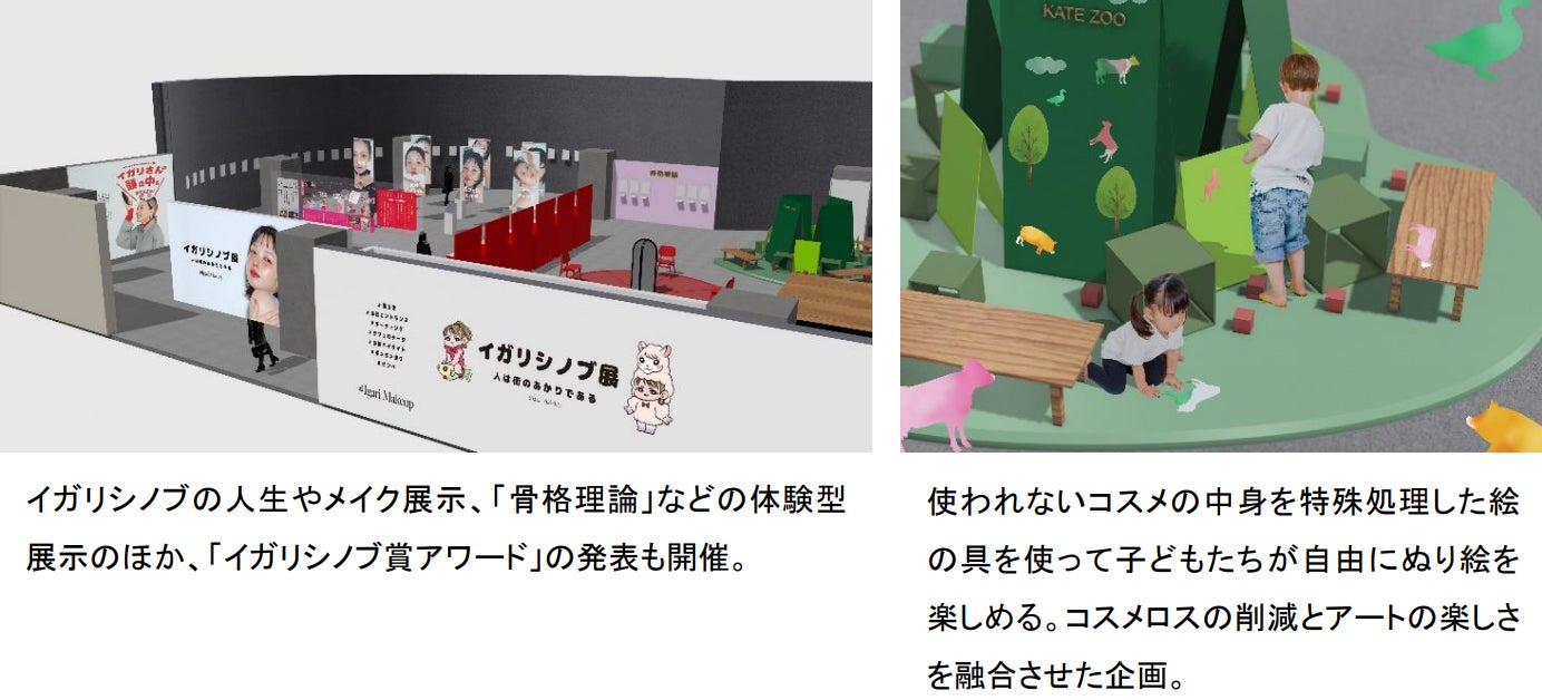 彼女のオリジナルメイクや骨格理論を体験できるブースや子ども向けのぬり絵コーナーなどがあり、コスメロスの削減とアートの楽しさを融合しています。