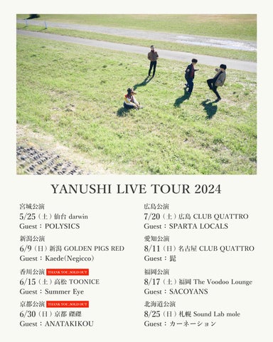 恵比寿LIQUIDROOMでの公演は即日ソールドアウトし、”YANUSHI LIVE TOUR 2024″にはSPARTA LOCALS、SACOYANS、カーネーションが追加ゲストとして出演します。