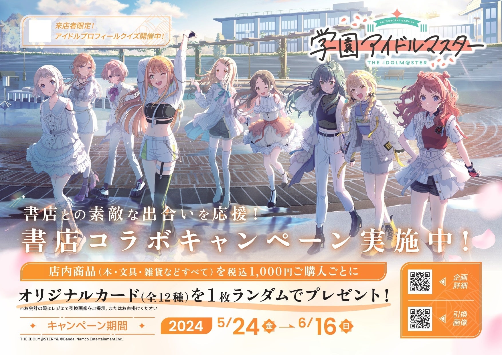 さらに、店頭のQRコードから参加できる「アイドルプロフィールクイズ」もあり、賞品には「初星学園パンフレット」やオリジナルデザイン図書カードが含まれます。