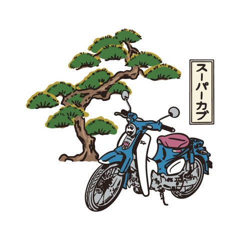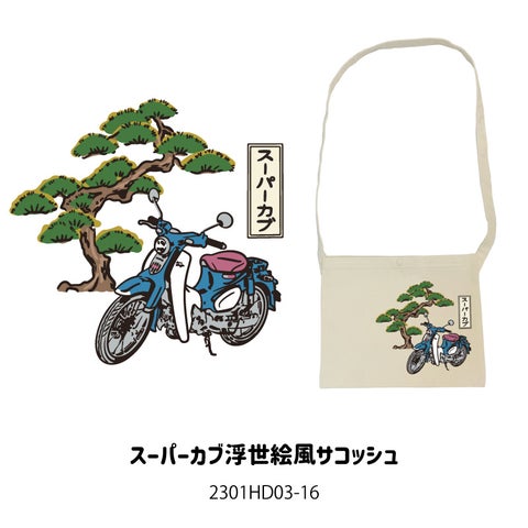 - Tシャツ、キャップ、浮世絵風スーパーカブTシャツ、ラインタッチカブキャップ、トートバッグ、サコッシュ