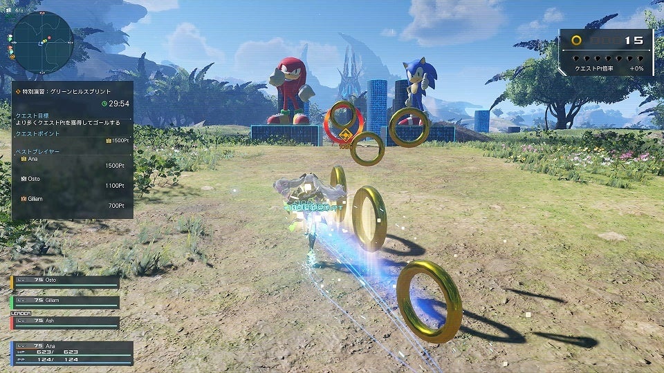 フィールドに多数設置されている「リング」の取得や、エネミーに最後の一撃を与えると得られるクエストポイントを競う独自ルールのクエストとなっており、クリア時の順位に応じてN-メセタ(ゲーム内通貨)が獲得できます。また、フィールドにランダムで7個配置される「カオスエメラルド」を取得すると、クエストポイントを得られるだけでなく、その後取得するクエストポイントに倍率がかかります。