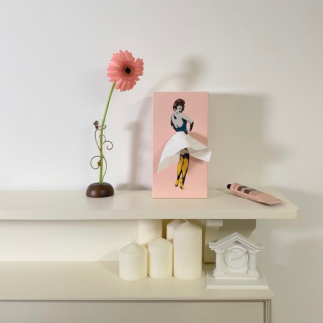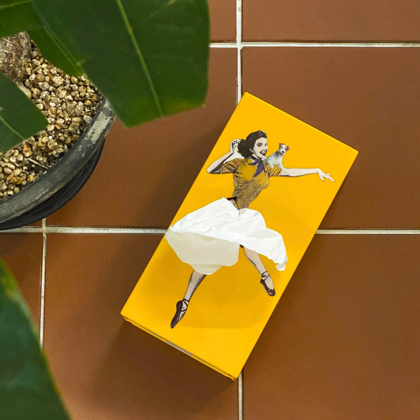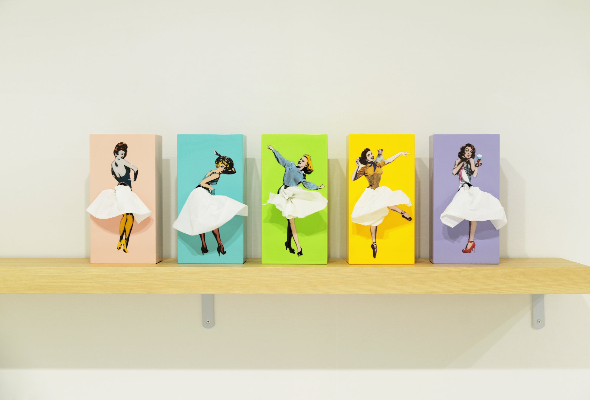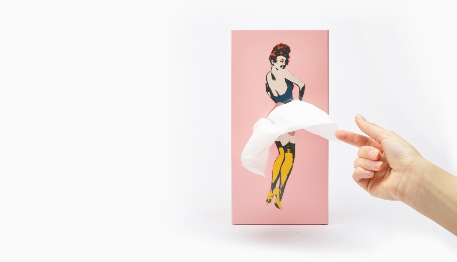 彼らの新作「フラッパーティッシュ/ティッシュアップガール」は、ティッシュをスカートに見立てたティッシュケースで、女性のイラストが描かれたメタル素材のケースが特徴です。