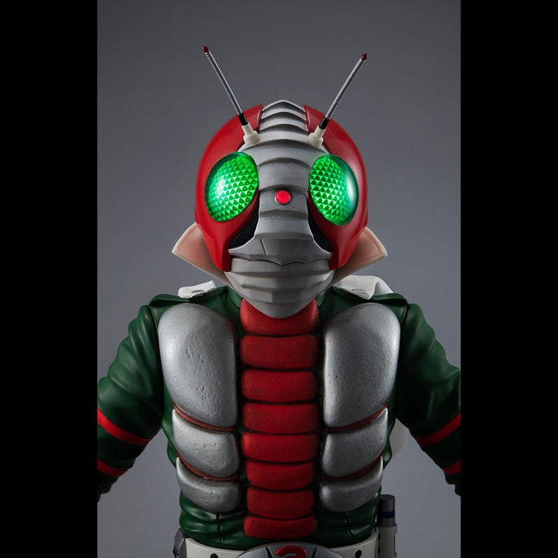 変身!V3!!、’73年、全国の子供たちに圧倒的人気を誇り、今なおファンに高い支持を受け続けている『仮面ライダーV3』が放映50周年を記念して、UAシリーズにいよいよ登場!全高約40cmのビッグスケール、至高のディテールに加え、迫力のライト&サウンドギミックを内蔵!