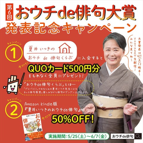 キャンペーンでは、「おウチde俳句くらぶ」への新規入会でQUOカード500円分プレゼントや、電子書籍版『夏井いつきのおウチde俳句』が50%OFFなどの特典があります。