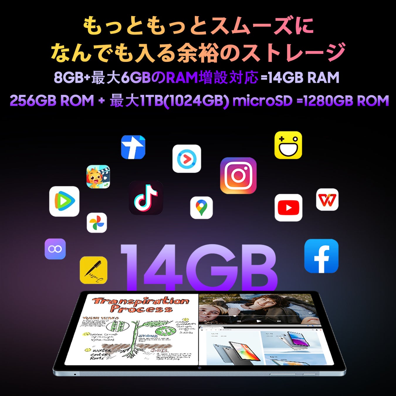 このタブレットは、10.5インチの大画面で、超高性能な8コアCPUを搭載しており、14GBのメモリと256GBのストレージがあります。