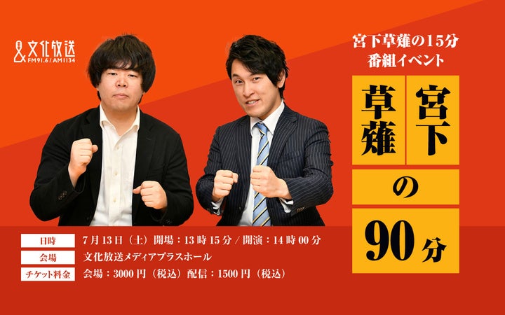 人気お笑いコンビ・宮下草薙の番組「宮下草薙の15分」がイベント「宮下草薙の90分」を開催します。