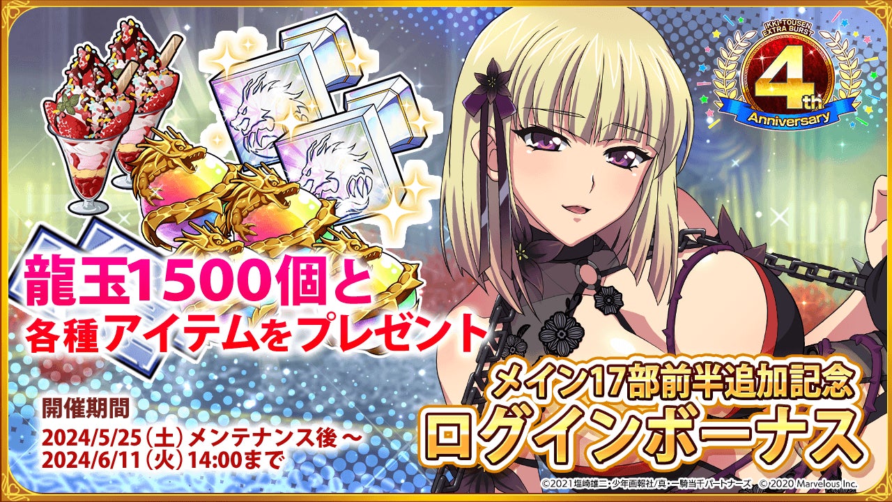 ログインすると豪華アイテムがもらえる他、最大100連無料のガチャも!期間は2024/5/25から6/11まで。