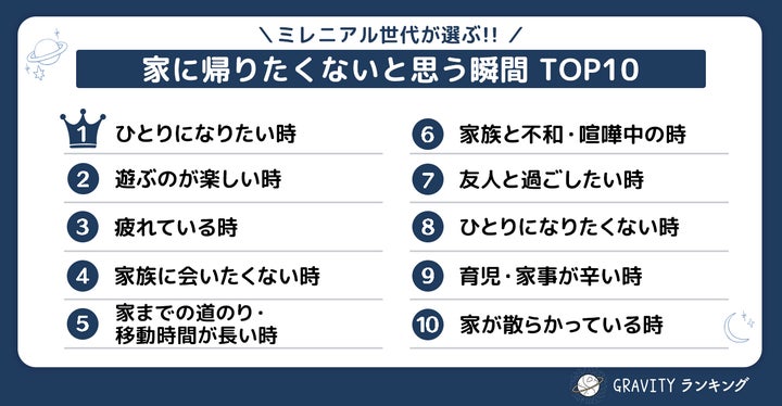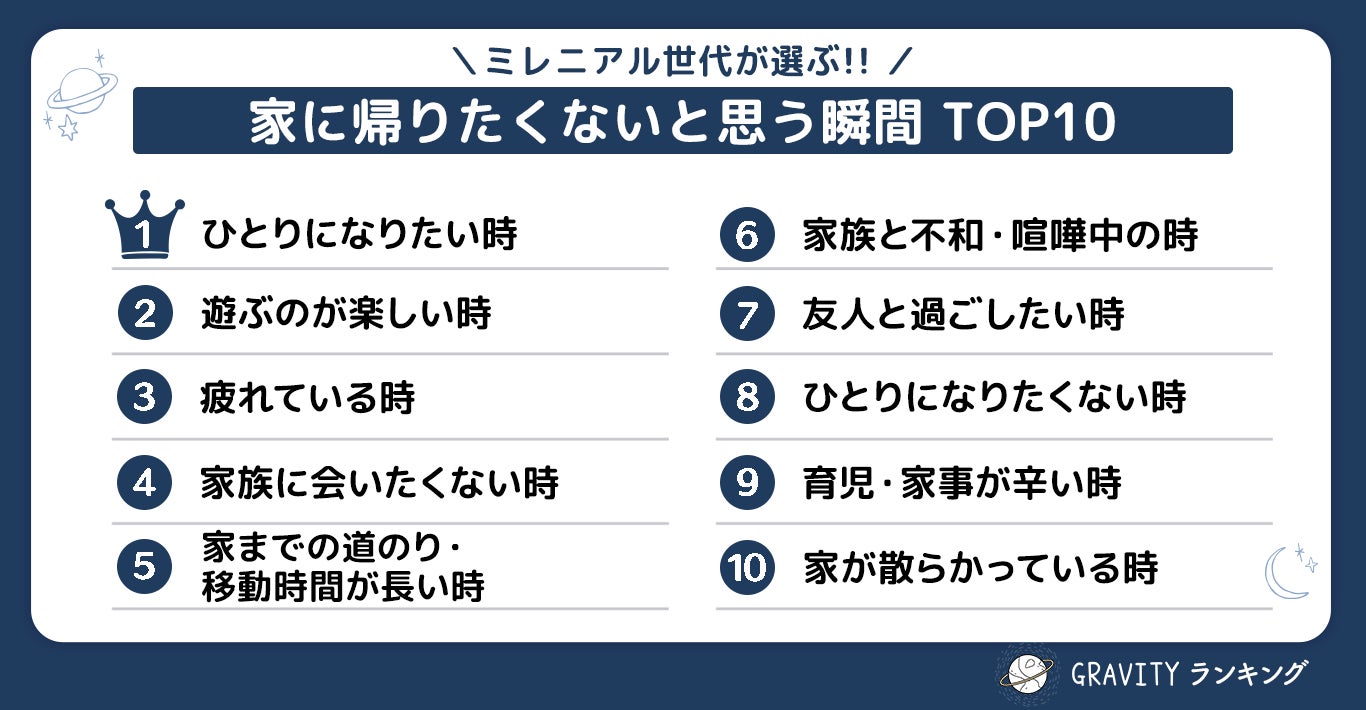 ミレニアル世代が家に帰りたくない瞬間TOP10を調査した結果、1位はひとりになりたい時で、家族や仕事から離れたいという声が挙がりました。