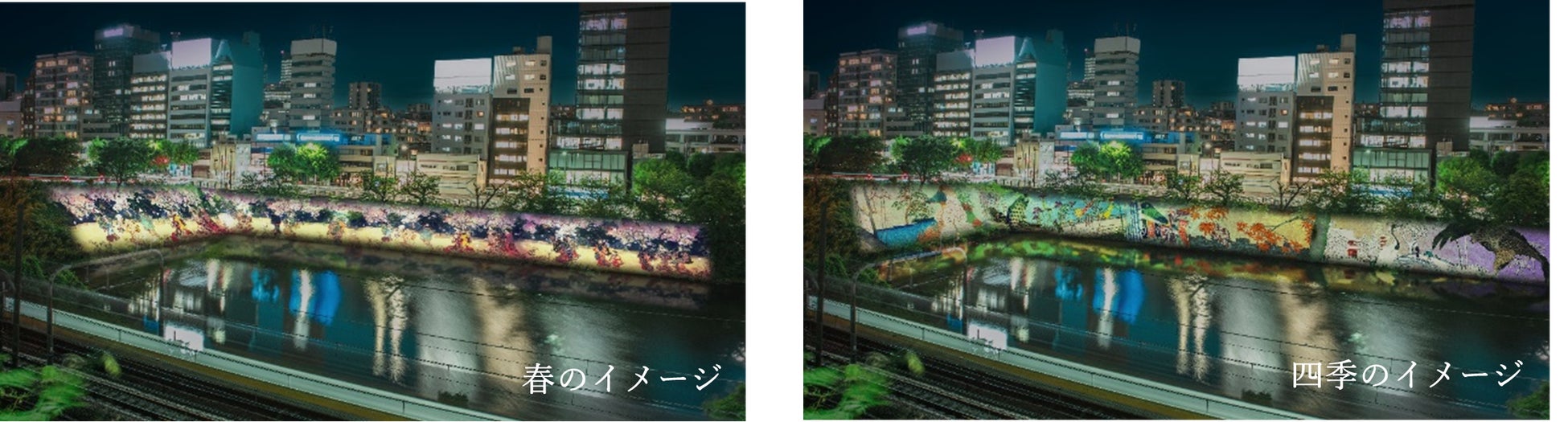 歌川広重の浮世絵をモチーフにしたアニメーションやプロジェクションマッピングが外濠の景観を彩ります。
