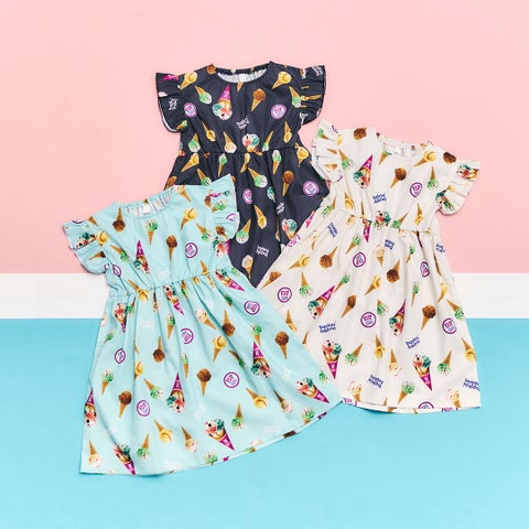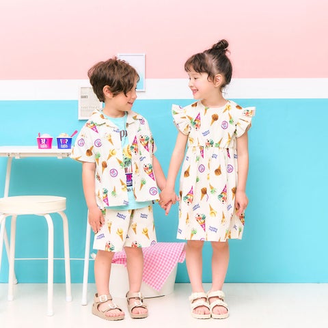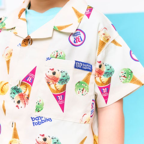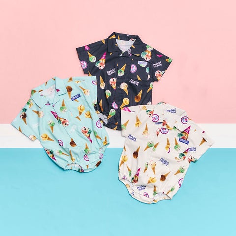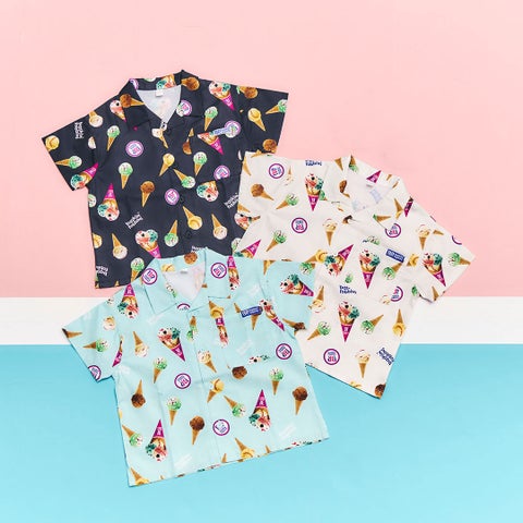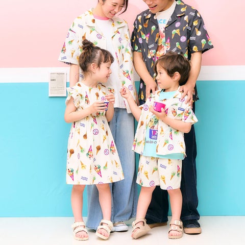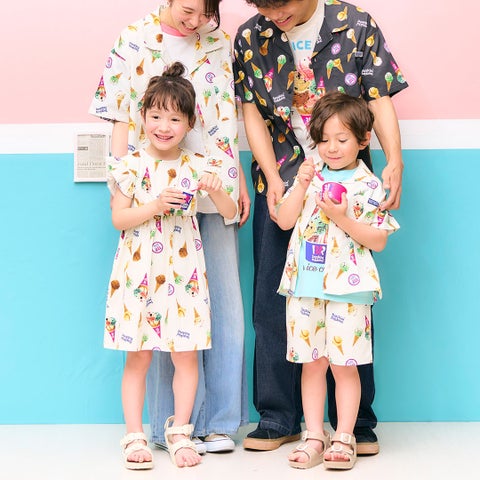 総柄デザインのワンピースやシャツ、ハーフパンツなどには人気フレーバーがちりばめられ、家族でリンクコーデも楽しめます。