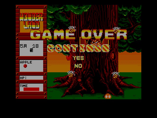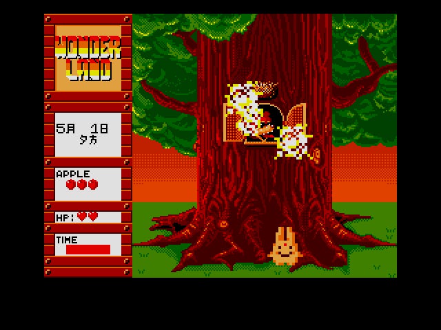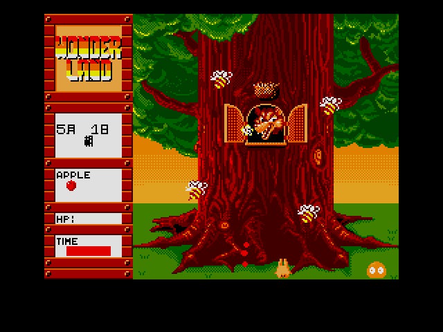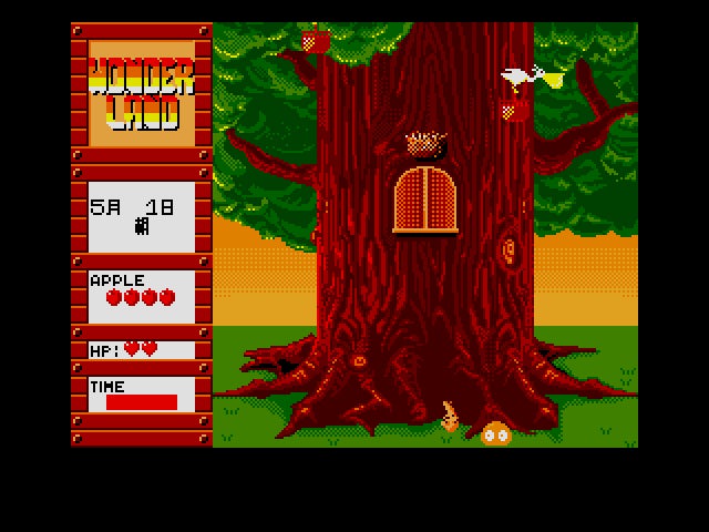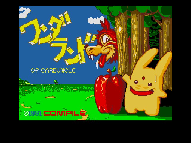 一方、1991年のMSX2版「ワンダーランド OF CARBUNCLE」は、カーバンクルの活躍を描いた風変わりなシューティングゲームで、プレイヤーはりんごを集めながらボスと戦います。