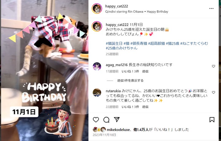 長寿猫で人気のインスタグラムスター、みけちゃんが魅力的で多くのファンを魅了しています。