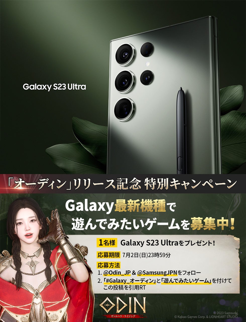 『オーディン:ヴァルハラ・ライジング』は、Samsung Japan社と提携し、6月16日(金)から最新フラッグシップモデル「Galaxy S23シリーズ」とのコラボし、「『オーディン』リリース記念特別キャンペーン」を実施中です。