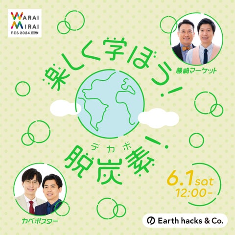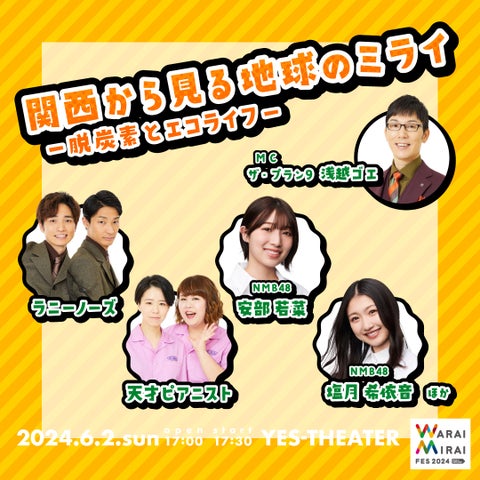 「Warai Mirai Fes 2024~Road to EXPO 2025~」のなんば広場特設ステージイベント「楽しく学ぼう!脱炭素!」では、関根澄人氏や藤崎マーケットらが大喜利形式で脱炭素について楽しく語ります。