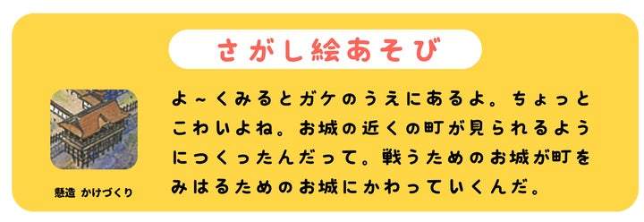 - 大型フロア迷路やさがし絵遊びも楽しめ、時代考証に基づくお城イラスト展示