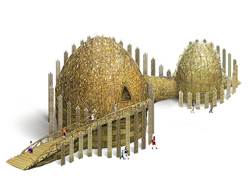 この作品は、竹で編まれた大小の構造物で、和歌山県の山々をイメージしています。