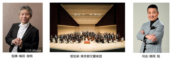 指揮者は梅田俊明氏で、東京都交響楽団が演奏し、司会は朝岡聡氏が務めます。